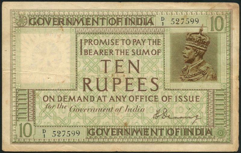 (x) Government of India, 10 Rupees, ND (1917-30), serial number D/1 527599, green and brown, King George V at upper right, Denning signature, reverse value at upper right and in eight languages at centre