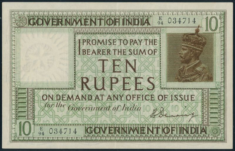 (x) Government of India, 10 rupees, ND (1917-1930), serial number E/94 034714, green, white and brown, George V top right, Denning signature, reverse brown, pale green and white