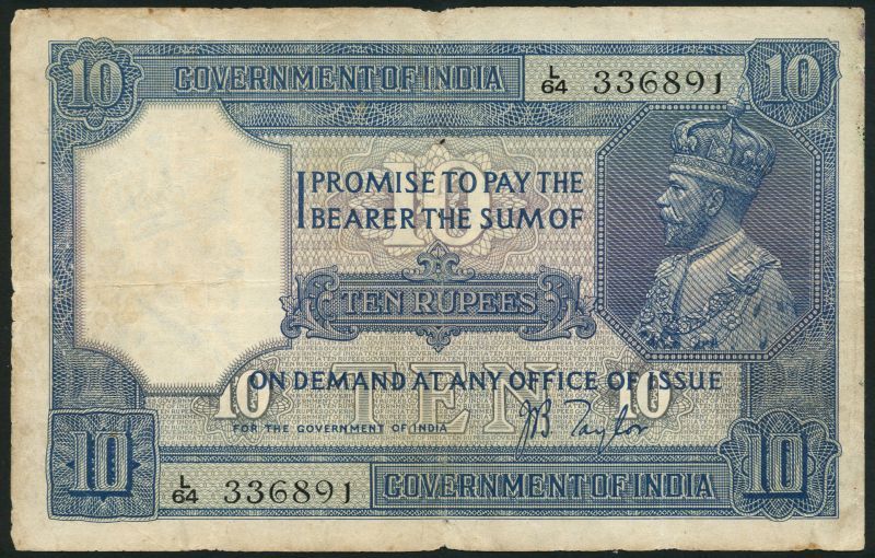 (x) Government of India, 10 Rupees, ND (1925), serial number H/7 928856, signature H. Denning; 10 Rupees, ND (1926-32), serial number L/64 336891, signature J. B. Taylor, both dark blue on grey and purple underprint, King George V at upper right, reverse value at upper right and lower left and in nine languages at centre