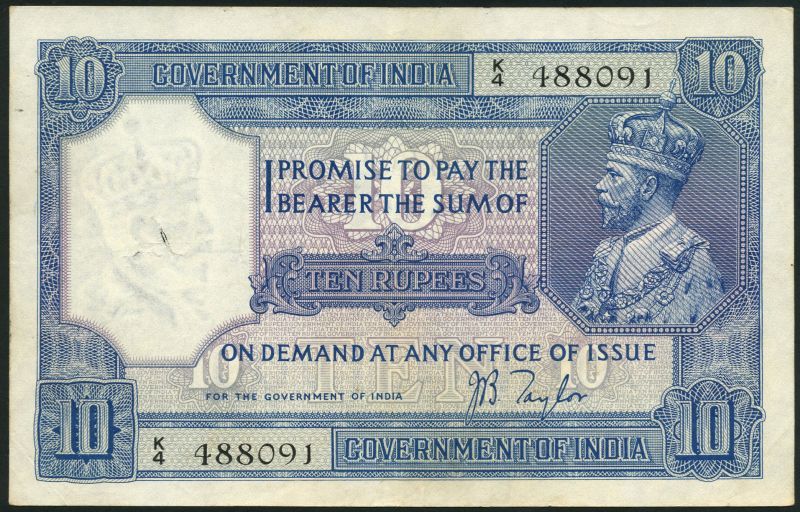 (x) Government of India, 10 rupees, ND (1917-30), serial number K/4 488091, dark blue on purple and green underprint, George V at right, Taylor signature