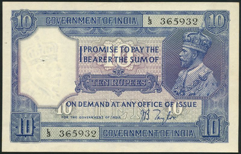 Government of India, 10 Rupees, ND (1925-30), serial number L/3 365932, signature J. B. Taylor, dark blue on grey and purple underprint, King George V at upper right, reverse value at upper right and lower left and in nine languages at centre