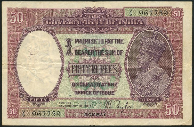 Government of India, 50 rupees, Bombay, ND (1930), serial number V/5 967759, lilac and green, George V at right, Taylor signature low right, reverse lilac and pale green