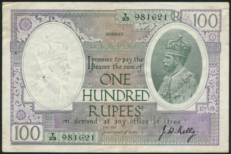 Government of India, 100 rupees, Bombay, ND (1927), serial number T/23 981621, lilac, green and white, George V at right, Kelly signature, BOMBAY in green top centre, reverse green and lilac