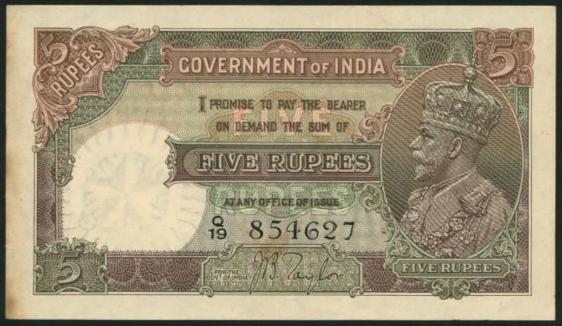 Government of India, 5 Rupees (2), ND (1928-35), serial numbers P/5 107258 and Q/19 854627, both signature J. B. Taylor, brown-violet and light brown, oval portrait of King George V at right, reverse value in guilloche at left and in eight languages at centre