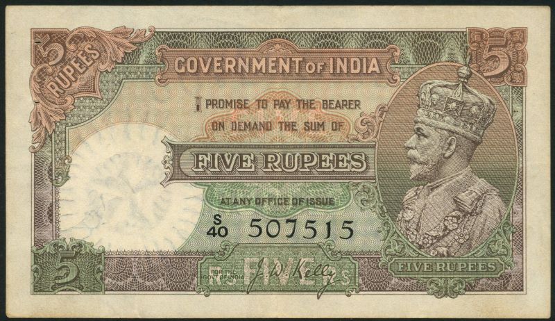 Government of India, 5 Rupees (2), ND (1928-35), serial numbers R/96 851586 and S/40 507515, both signature J. W. Kelly, brown-violet and light brown, oval portrait of King George V at right, reverse value in guilloche at left and in eight languages at centre