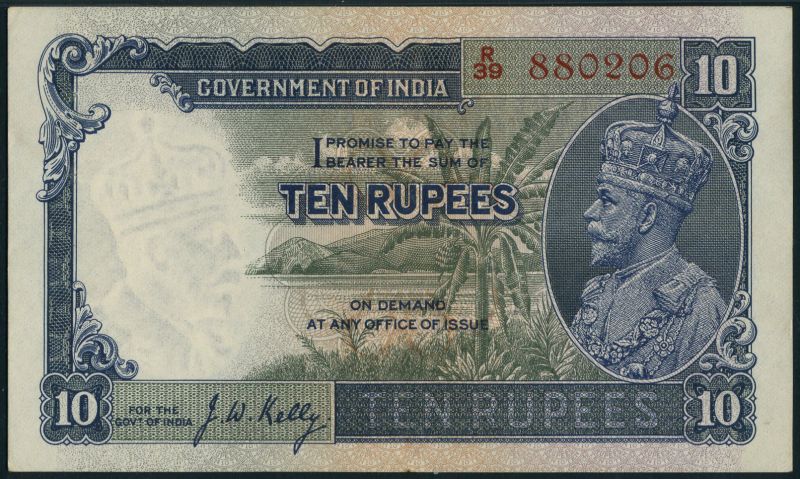 (x) Government of India, 10 rupees, ND (1928-1935), red serial number R/39 880206, blue and green, George V at right, tree in field, Kelly signature, reverse pale blue, elephants at centre