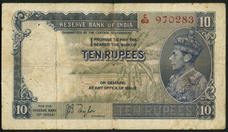 Government of India, 1 rupee, blue and orange, George V at right, Kelly signature, 1,2,5 and 10 rupees, all George VI at right
