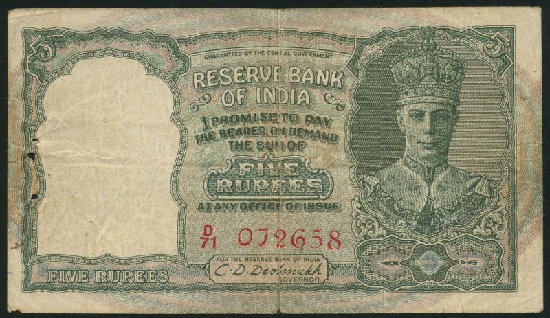 (x) Reserve Bank/Government of India, 1 Rupee, ND (issued 1947), red serial number D/96 153317, blue-grey, dated coin depicting King George VI at upper right; 2 Rupees, ND (1949), red serial number H/49 800316, signature C. D. Deshmukh, lilac, King George VI at right; 5 Rupees, ND (1947), red serial number D/71 072658, green, King George VI facing at right