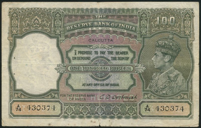 Reserve Bank of India, 5 Rupees, ND (1937), serial number C/13 130841, signature J. B. Taylor, brown-violet and light brown, oval portrait of King George VI at right, reverse value in guilloche at left and in eight languages at centre; 100 Rupees, Calcutta, ND (1943), serial number A/74 430374, signature C. D. Deshmukh, dark green and lilac, King George VI at right, reverse tiger at centre, profile watermark