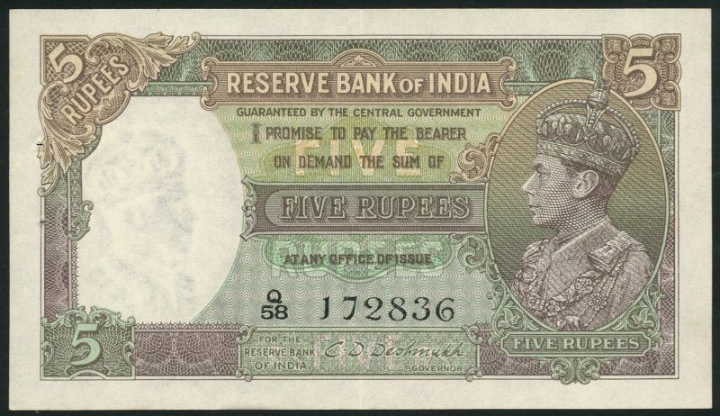 (x) Reserve Bank of India, 5 rupees, ND (1944), serial number Q/58 172836, purple and green and pale orange, George VI at right, Deshmukh signature low centre