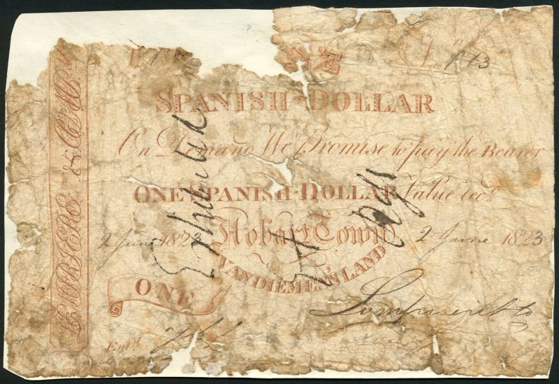 (x) Van Diemen's Land, Lempriere and Company, 1 Spanish dollar, Hobart town, 2 June 1823, serial number A13, redtext on white, initials elided at left in vertical format, manuscript signature of Lempriere low right, also another Spanish dollar dated 20 June 1823, serial number M5, red and white