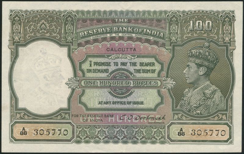 (x) Reserve Bank of India, 100 rupees (2), ND (1937), Calcutta, serial number A/88 305769/770, green and lilac, George VI at right, value at centre and top right, Deshmukh signature, also 10 rupees (2), 1937 and 1943