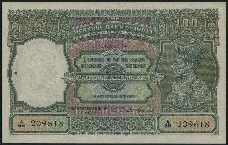 (x) Reserve Bank of India, 100 rupees, Calcutta, ND (1943), serial number A/88 209618, green and purple, George VI at right, Deshmukh signature low right, reverse green, tiger at centre
