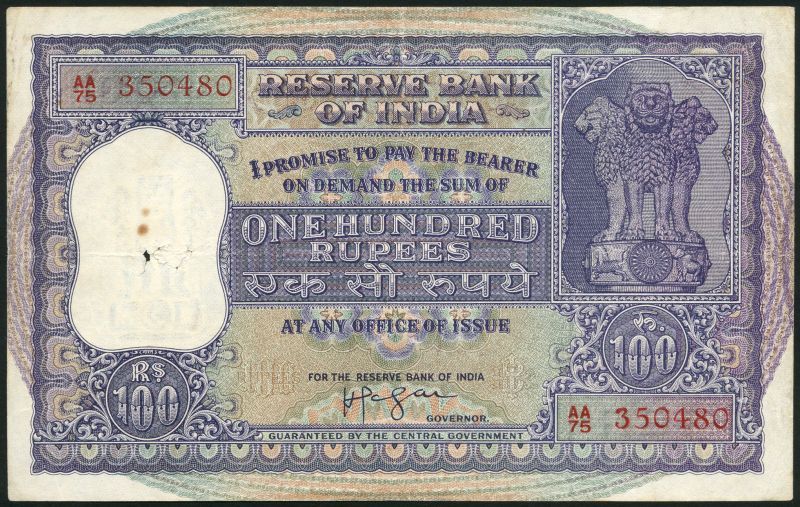 (x) Reserve Bank of India, 5 Rupees, ND (1943), black serial number, green and multicoloured, King George VI at right, reverse antelopes; Government of India, 1 Rupee, 1940, black serial number, coin with bust of King George VI at upper right, reverse dated coin at upper left; Reserve Bank, 100 Rupees, ND, purple and multicoloured, Asoka column at right, reverse dam