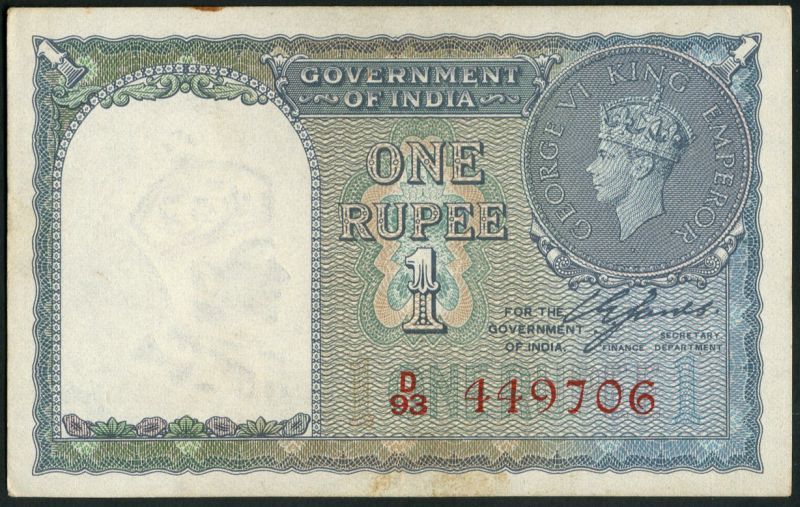 (x) Government of India, 1 Rupee, ND (issued 1944), red serial number D/93 449706, blue-grey and multicoloured, dated coin depicting King George VI at upper right, reverse coin at upper left, value at lower left
