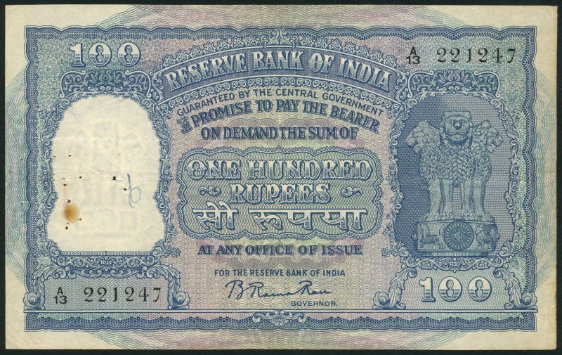 (x) Reserve Bank of India, 100 Rupees (5), ND, signature B. Rama Rau, prefix A/9, value in English only; prefixes A/5, A/13 and H/12, value in English and error Hindi; prefix A/25, red serial number, value in English and corrected Hindi, all signature B. Rama Rau, blue on multicoloured underprint, Asoka column at right, reverse elephants