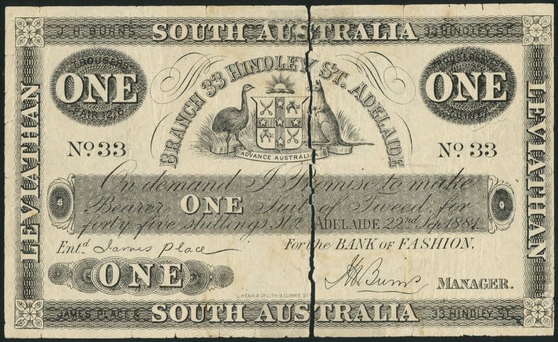 (x) Australia, Bank of Fashion, a skit note for 1 suit, Adelaide, 22 September 1881, black and white, Australian arms top centre, printed signatures below,