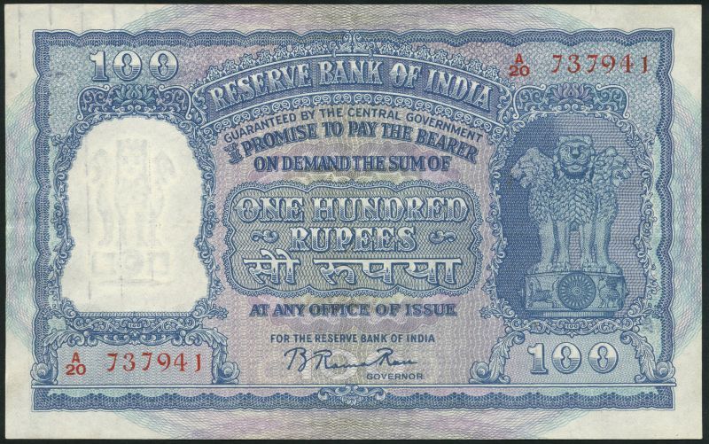 Reserve Bank of India, 100 rupees, ND (1953), red serial number A/20 737941, blue and lilac, Ashoka column at right, Rama Rau signature, also 100 rupees, ND (1962), purple and multicoloured, as previous, Bhattacharya signature