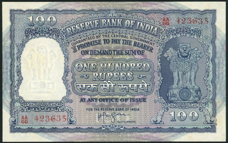 (x) Reserve Bank of India, 100 rupees (2), ND (1957-1962), red serial number AA/66 423636/636, blue and lilac, Ashoka column at right, Lengar signatures