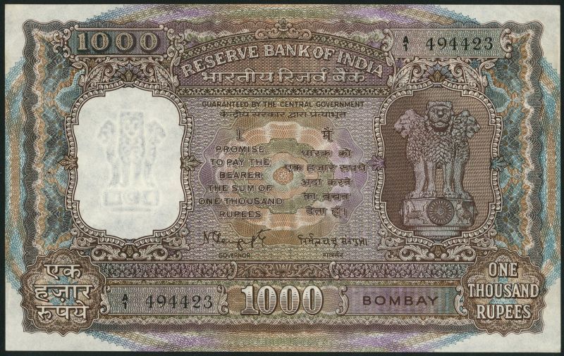 (x) Reserve Bank of India, 1000 rupees, Bombay, ND (1975), black serial number A/1 494423, brown and lilac, Ashoka column at right, Sengupta signature