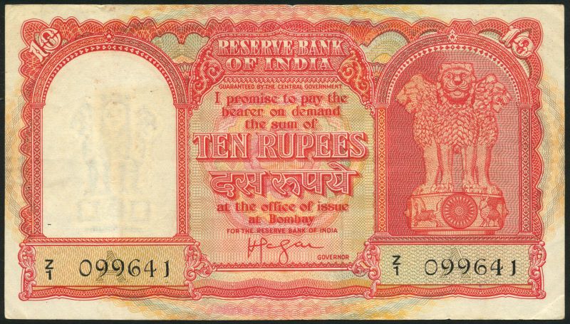 Reserve Bank of India, 10 Rupees, Persian Gulf Issue, ND, serial number Z/1 099641, signature H. V. R. Iengar, red, Asoka column at right, reverse dhow