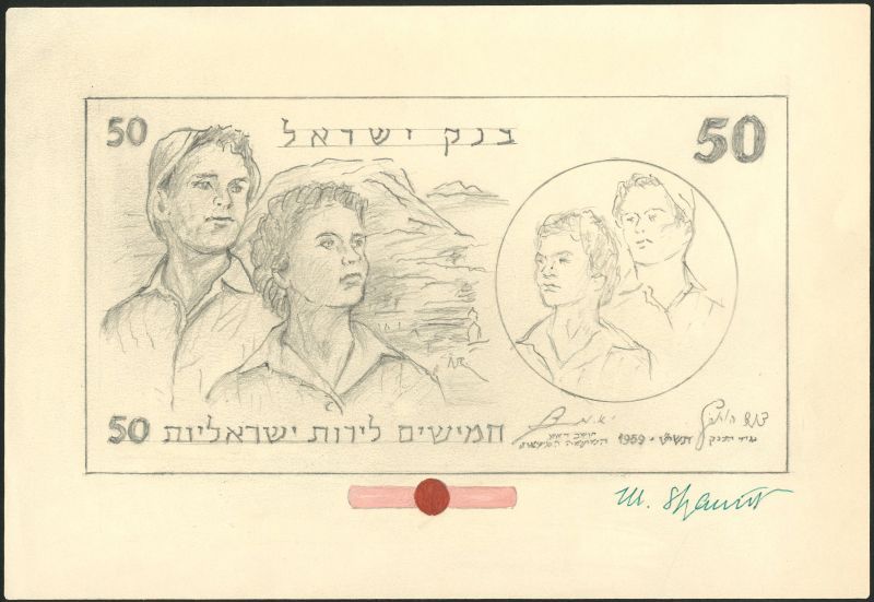 (Pick 33 for type, Arkin page 89 for design) manuscript signature of Maxim Shamir low right, unique. The couple used as models for the note were Aryah Eyal and Tsuria Ronen, Polish and Yemeni respectively. They were according to Arkin friends of an aquaintance of the Shamir brothers.