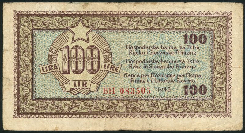 (x) State Bank for Istria, Rijeku I Slovensko Primorje, 100 Lire, 1945, serial number BH 083505, brown and blue, value at left set in borders of entwined leaves, reverse sailing ship at left, value at right