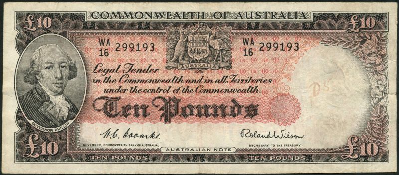 Commonwealth of Australia, 10 shillings (2), 1939/1942, orange and pale blue, George VI at right, arms low centre, Sheehan/McFarlane and Armitage/McFarlane signatures respectively, also £10, ND (1960), Coombs-Wilson signatures, black and mauve, Governor Phillip at left