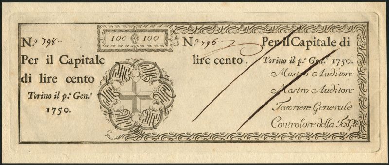 (x) Torino, 100 lire, 1750, serial number 798, at left, 796 at right, black text on parchment like paper, arms low left