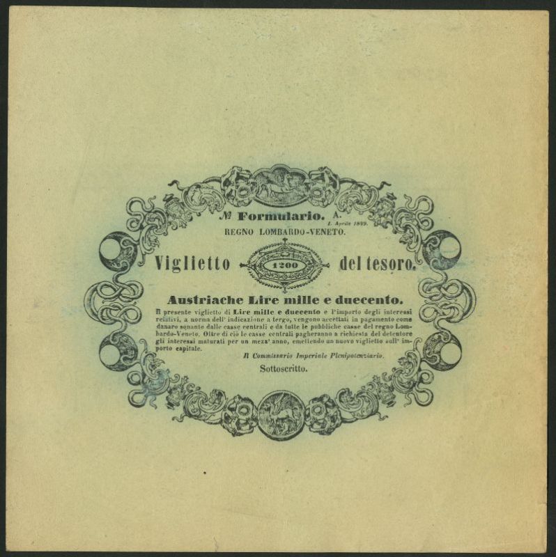 Regno Lombardo-Veneto, Viglietto del Tesoro, 1200 Lire Formulare (2), 1 April 1849, the first black on bright green paper, the second black on buff paper, both oval chain of serpents with winged horses at upper and lower centre, reverse prospectus of interest