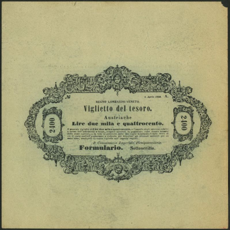 Regno Lombardo-Veneto, Viglietto del Tesoro, 2400 Lire Formulare, 1 April 1849, blue-black on buff paper, ornate oval frieze of acanthus leaves with cherubs at upper and lower centre, value at left and right, reverse prospectus of interest
