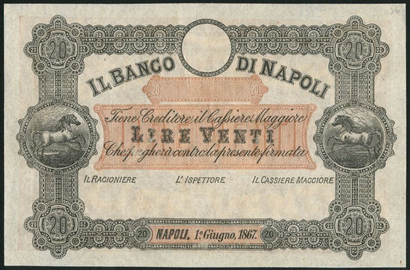 (†) Il Banco di Napoli, Italy, specimen 1 lire, 1867, black, white and blue, 5 lire, 1869, brown 10 lire, 1872, pale blue and brown, horse at left and right and a 20 lire, 1867, brown, horse at left and right