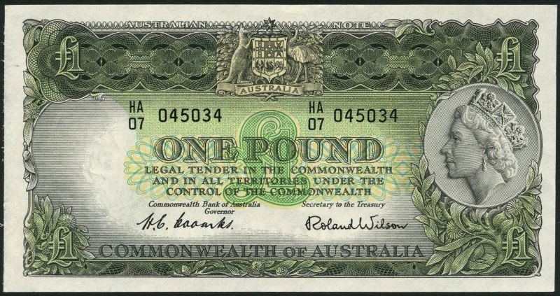 (†) Commonwealth of Australia, £1, ND (1961-1965), prefix HA/07, green, Elizabeth II at right, Coombs-Wilson signatures