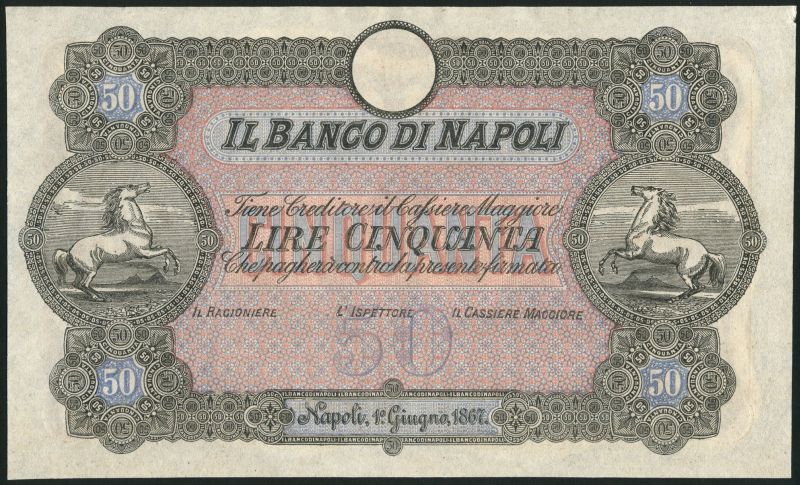 (†) Il Banco di Napoli, specimen 50 lire, 1 June 1879, no serial numbers, black, pink and lilac, prancing horse at left and right, reverse brown-purple, value at centre