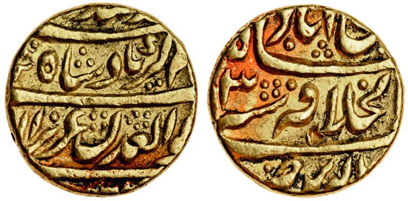 Mughal, 'Alamgir II, gold Mohur, 10.82g, Shahjahanabad, year 3, normal linear type (KM. 465.1), some slight red adhesions good very fine
