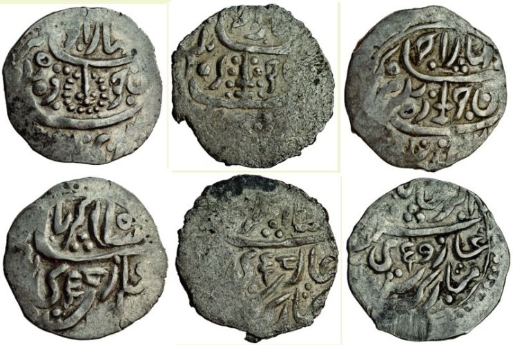 Garhwal, Gorkha occupation, Timashas (3), in the names of Muhammad Akbar II and Girvan Yuddha, Srinagar, one dated 67 in Nagari numerals on the reverse and with a double-hilted sword on the obverse, another dated 68 in Nagari numerals and the sword having four beads either side arranged vertically, and the third dated 68 with a single-hilted sword surrounded by 14 beads arranged in s circle, more or less (RGV 1395, 1399, the other not listed), usual flatness, very fine, very scarce (3)