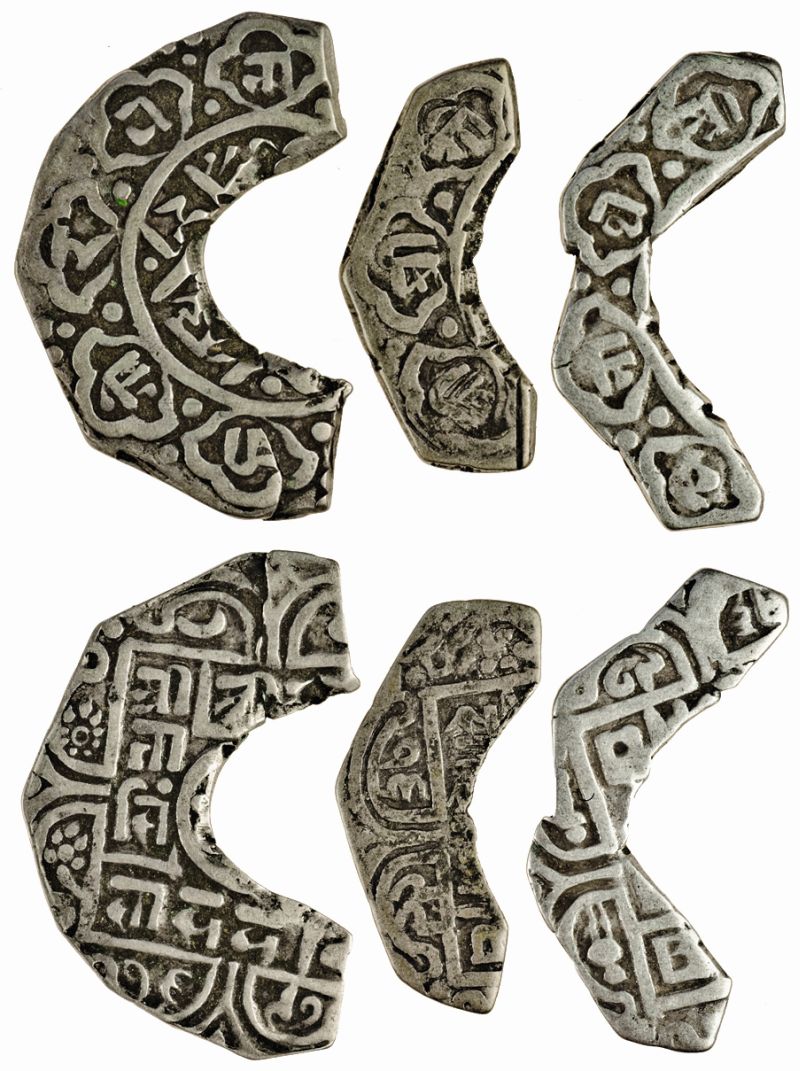 Nepal for Tibet, Pratap Simha, cut fractional Mohars (3) (2.04g, 1.10g and 0.84g), NS 16??, the larger piece with five petals (1-Sho), the second with four petals (7½-Skar), the smaller piece with three petals (5-Skar), all trimmed around the edge with central parts cut out, the second with corners also removed, very fine (3)