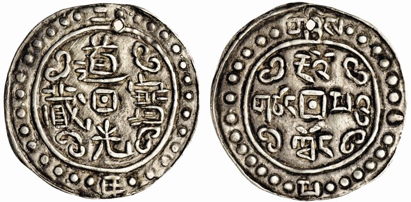 Tibet, Dao Guang, 1-Sho, 3.62g, 2nd year, 27 beads, 14 on left and 13 on right of date, rev. 26 beads, 13 both sides, legends as before (YZM 208-225; KM. C#93; LM 648var), holed at 12 o'clock, good fine