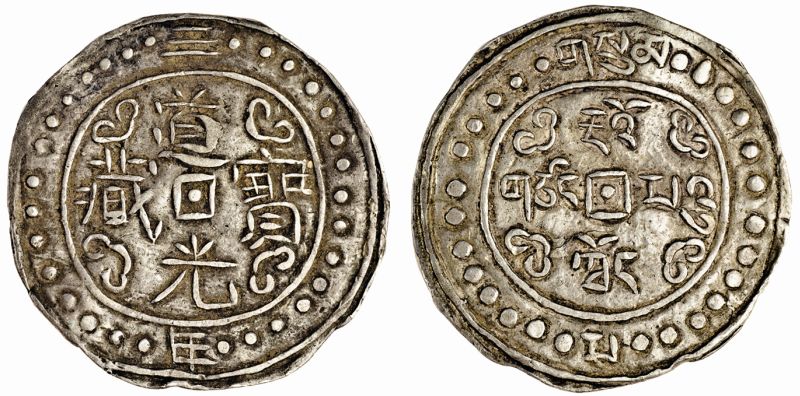 Tibet, Dao Guang, 1-Sho, 3.80g, 3rd year, 30 beads, 15 both sides of date, rev. 26 beads, 13 both sides, legends as before (YZM 226-233; KM. C#93; LM 649var), about very fine