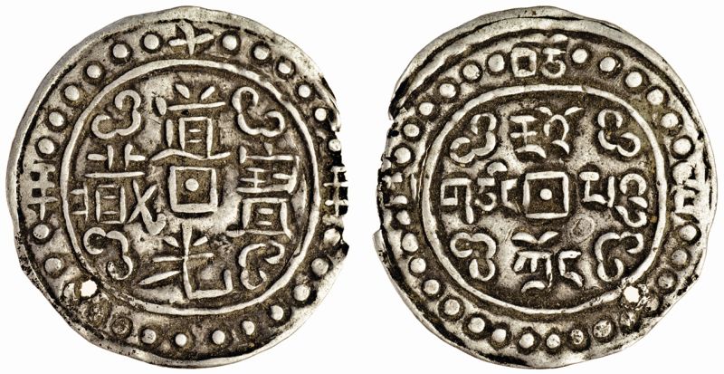 Tibet, Dao Guang, 1-Sho, 3.27g, 15th year, 25 beads, 6 in each upper segment, 13 in lower half, rev. 28 beads, 6 in each upper segment, 16 in lower half, the Tibetan syllable at 6 o'clock is spelt krong instead of kwong (YZM 240-242var; KM. C#93; LM 650var), small part of edge missing between 3 and 4 o'clock, about very fine and rare