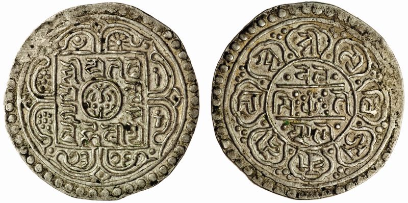 Tibet, Anonymous (meaningless date), Ranjana-Tangka, 4.58g, date given in Nepalese figures can be read as 16-72 (YZM 359; KM. C#27), good very fine