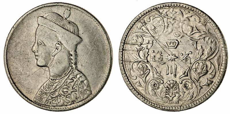 China, issued for Tibet, Sichuan Rupee, 11.28g, undated, small head without collar, rev. horizontal rosette (YZM 445-447; KM 3.1), scratches on obverse and reverse, fine and scarce