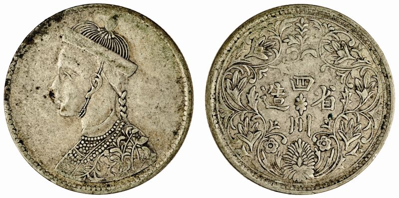 China, issued for Tibet, Sichuan Rupee, 11.22g, undated, small head with collar, rev. vertical rosette, with leaf in north-east position (YZM 451-472; KM 3.2), fine
