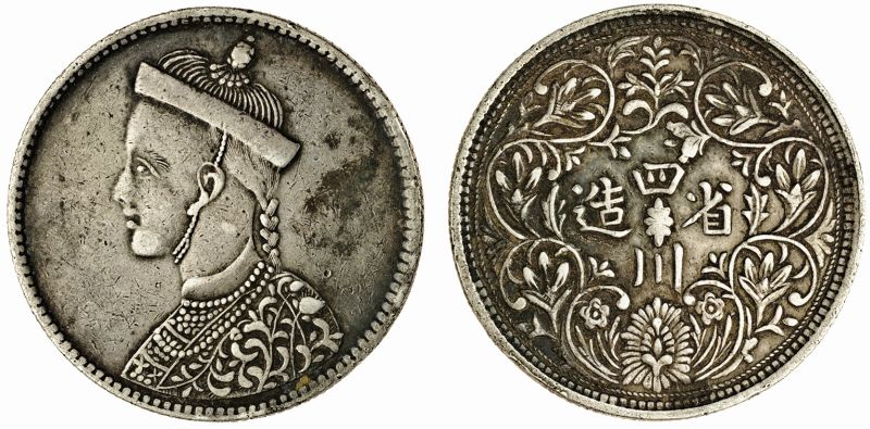 China, issued for Tibet, Sichuan Rupee, 11.22g, undated, small head with collar, rev. vertical rosette, with flower in the shape of a butterfly in northeast position (YZM 451-472; KM 3.2), in PCGS holder, graded XF40, rare