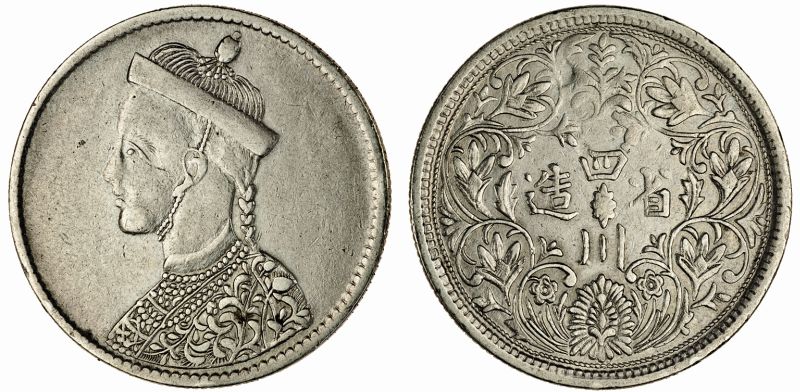 China, issued for Tibet, Sichuan Rupee, 11.33g, undated, small head with collar, string of pearls below the collar is composed of 13 pearls, instead of the usual 14, rev. vertical rosette, with flower in the shape of a butterfly in northeast position (YZM 451-454 and 457-472; KM 3.2), in PCGS holder, very fine and rare