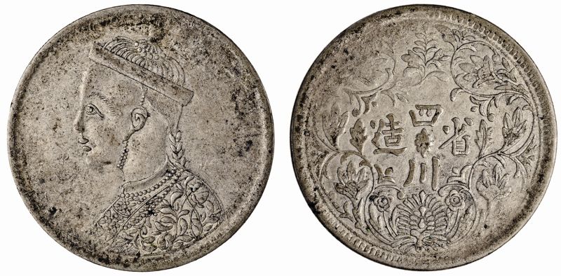 China, issued for Tibet, Sichuan Rupee, 10.80g, undated, small head with collar, string of pearls below the collar is composed of 15 pearls, instead of the usual 14, rev. vertical rosette, with leaf in northeast position (YZM 451-472; KM 3.2), weakly struck, about very fine