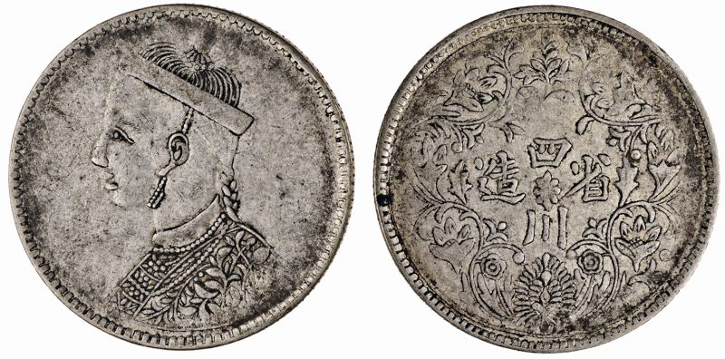 China, issued for Tibet, Sichuan Rupee, 11.43g, undated, small head with collar, string of pearls below the collar is composed of 16 pearls, instead of the usual 14, rev. vertical rosette, with leaf in northeast position (YZM 451-472; KM 3.2), about very fine