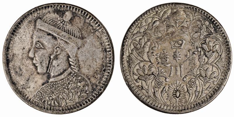 China, issued for Tibet (1936-42), Sichuan Rupee, 10.86g, undated, large head with collar, string of pearls below the collar is composed of 13 pearls, rev. vertical rosette, without leaf in northeast position (YZM 480-484; KM. Y #3b), very fine