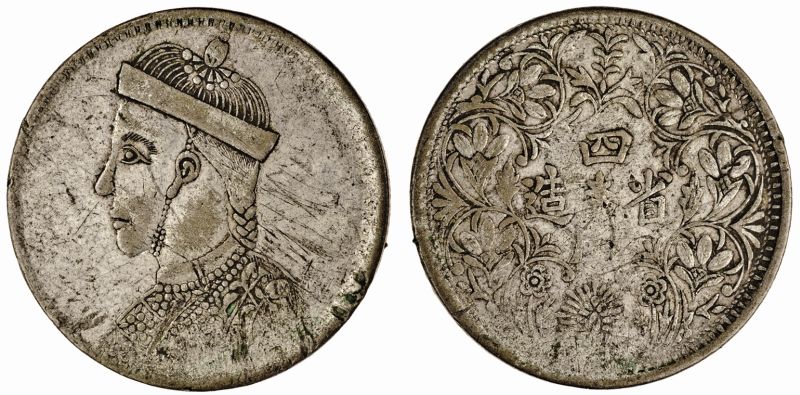 China, issued for Tibet, Sichuan Rupee, 11.46g, undated, large head with collar, string of pearls below the collar is composed of 13 pearls, rev. vertical rosette, without leaf in northeast position (YZM 480-484; KM. Y #3b), obverse scratches, fine