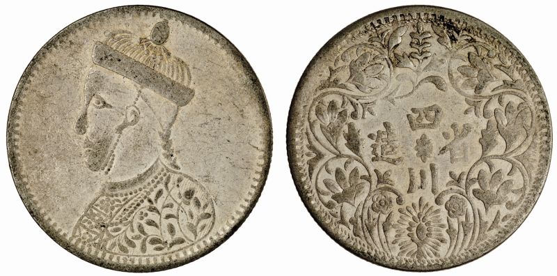 China, issued for Tibet, Sichuan Rupee, 11.15g, undated, large head with collar, string of pearls below the collar is composed of 14 pearls, rev. vertical rosette, without leaf in northeast position (YZM 480-484; KM. Y #3b), fine